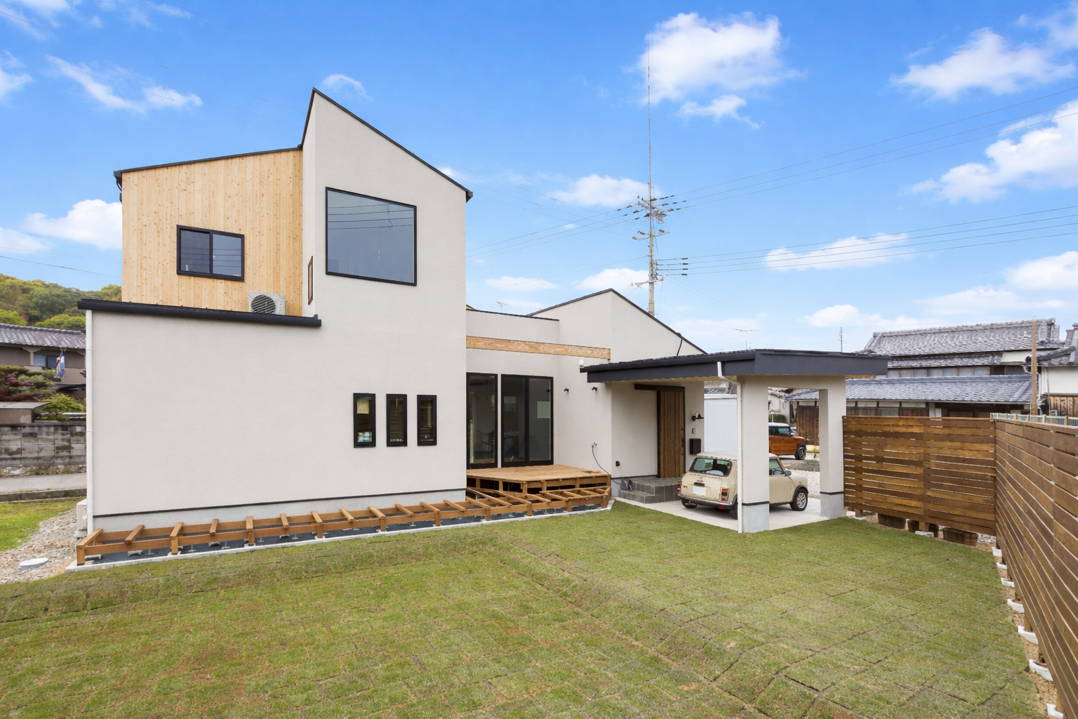 見る角度で表情が変わるアシンメトリーな外観に、ガルバリウムのシャープな質感と木製フェンスの温もりを組み合わせた一邸。