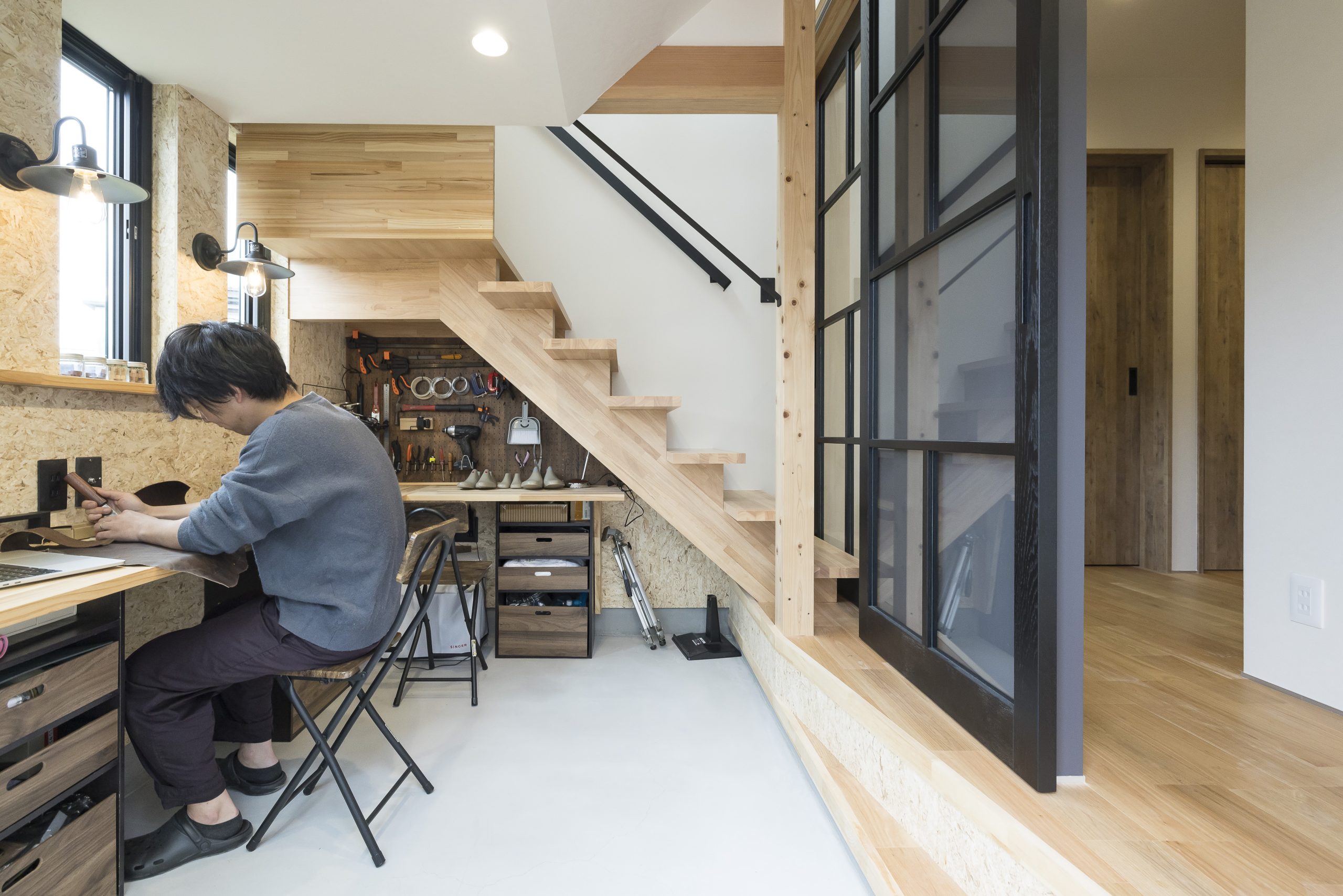 土間仕上げで汚れも気にせず作業できるし、室内側の建具をガラスにしたので、作業中でも家族の気配を感じられるようにしたのがこだわりです。
