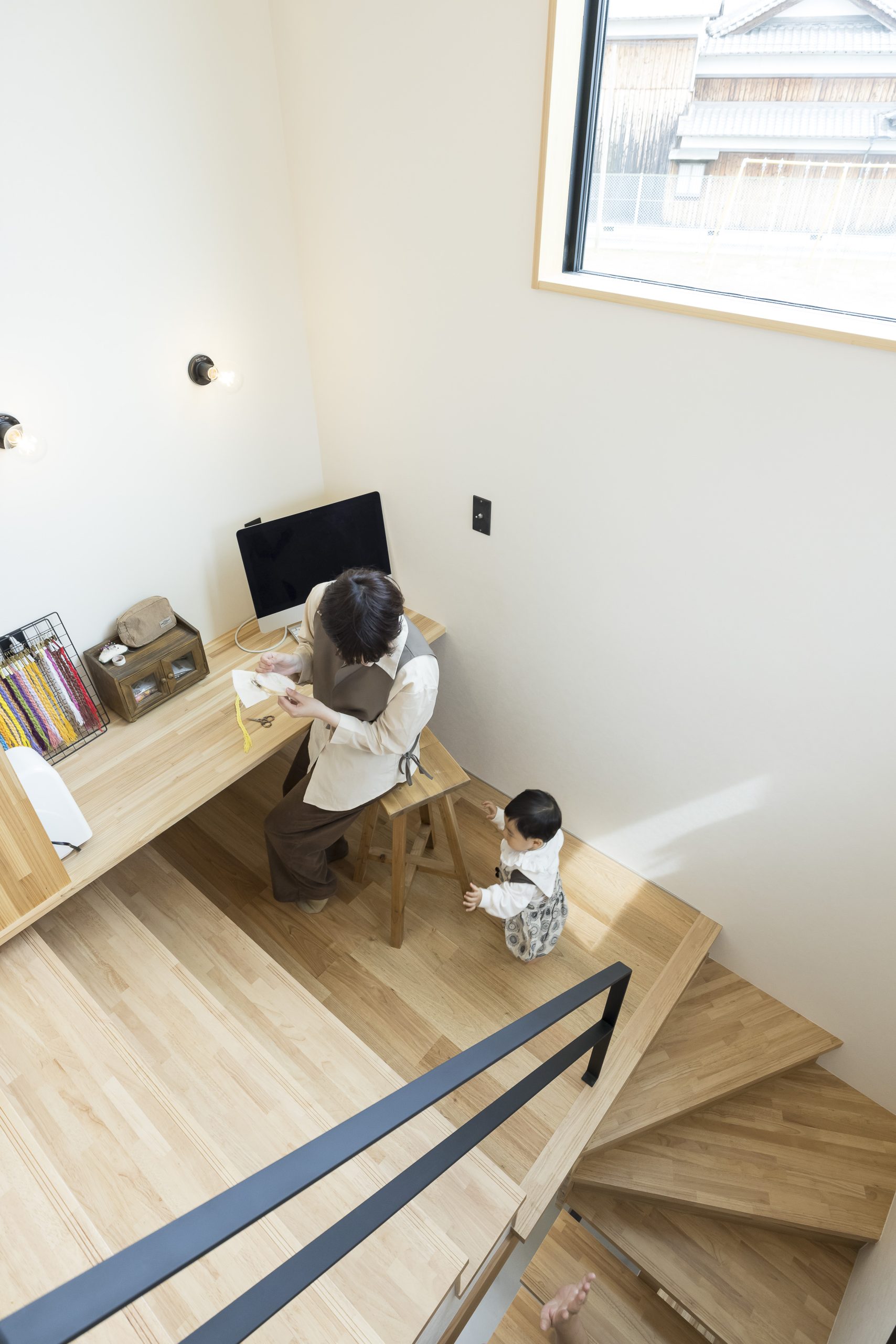 階段途中には奥さまのアトリエを設け、作業に集中できる“こもり感”のあるスペースを確保。