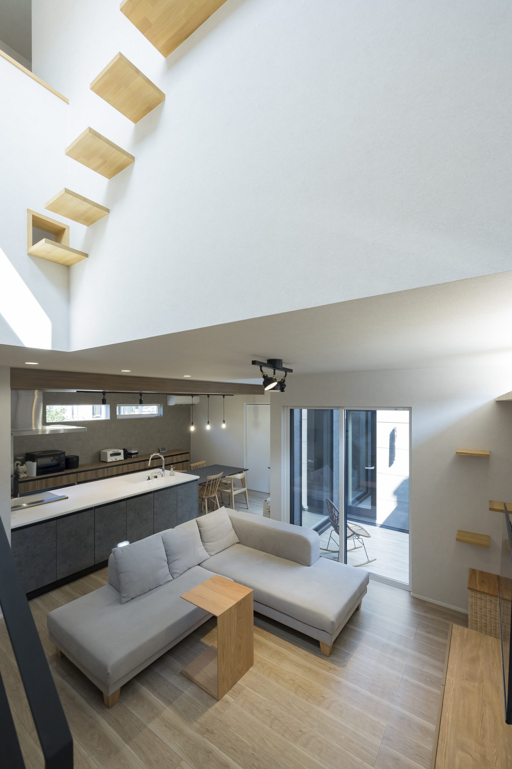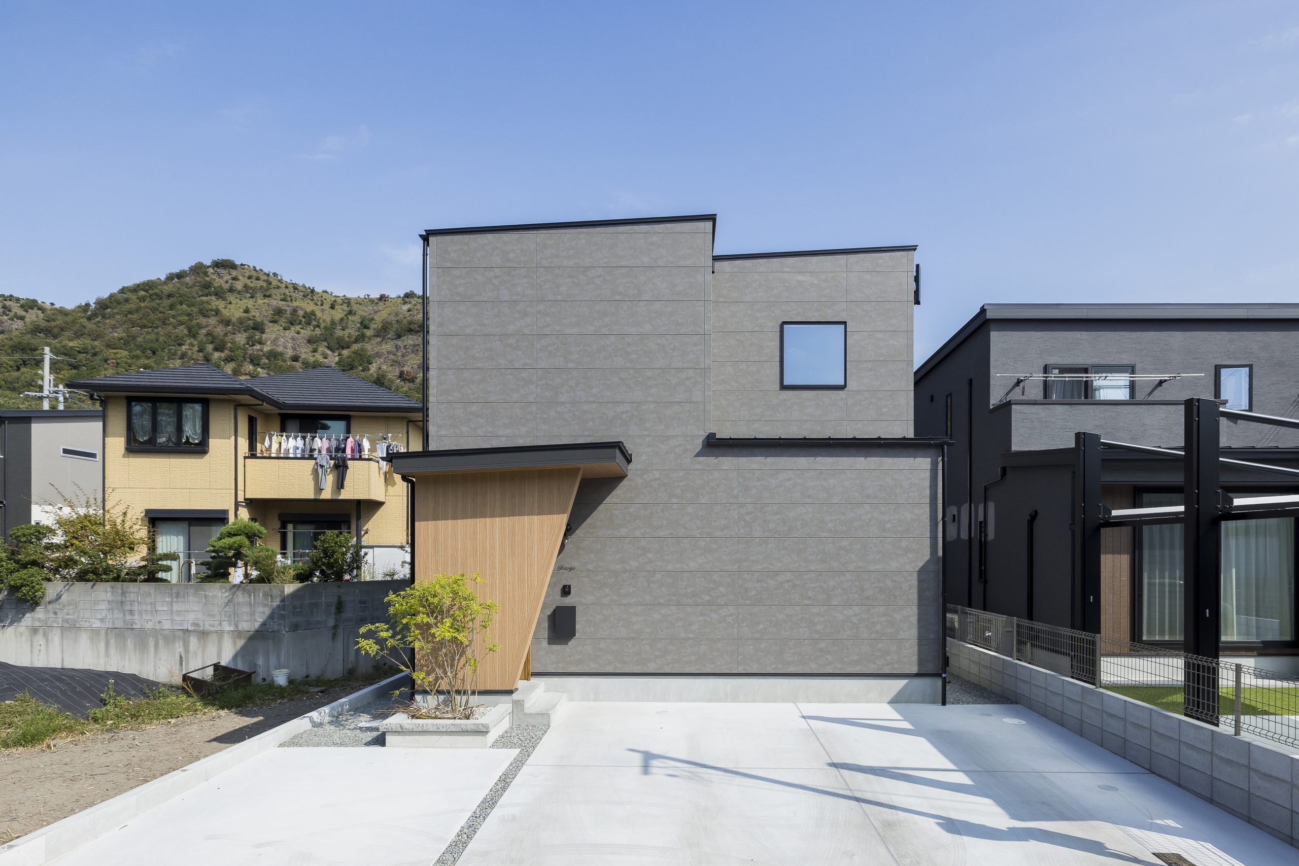 「木目×グレーの外観と、ネコと暮らす開放設計」