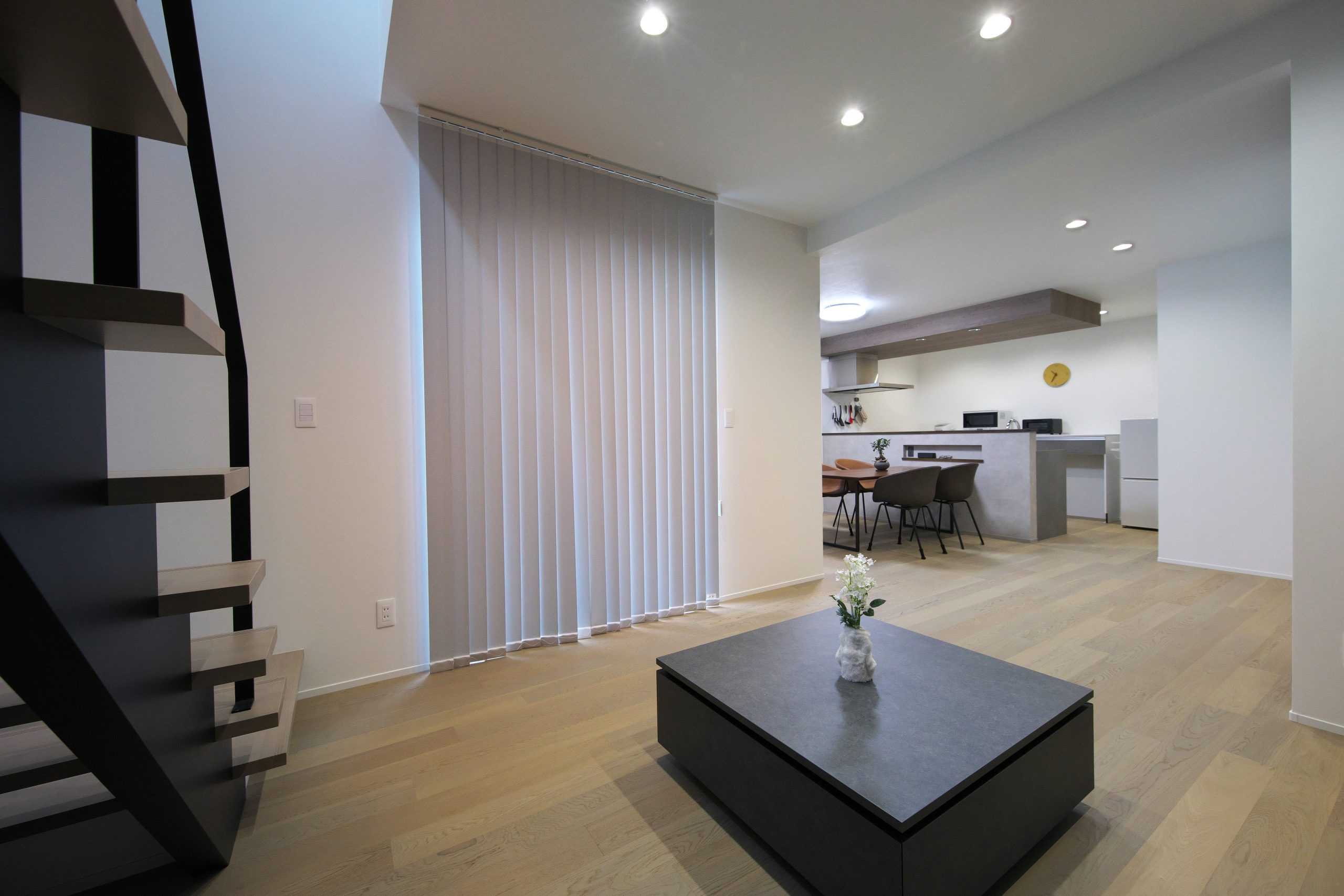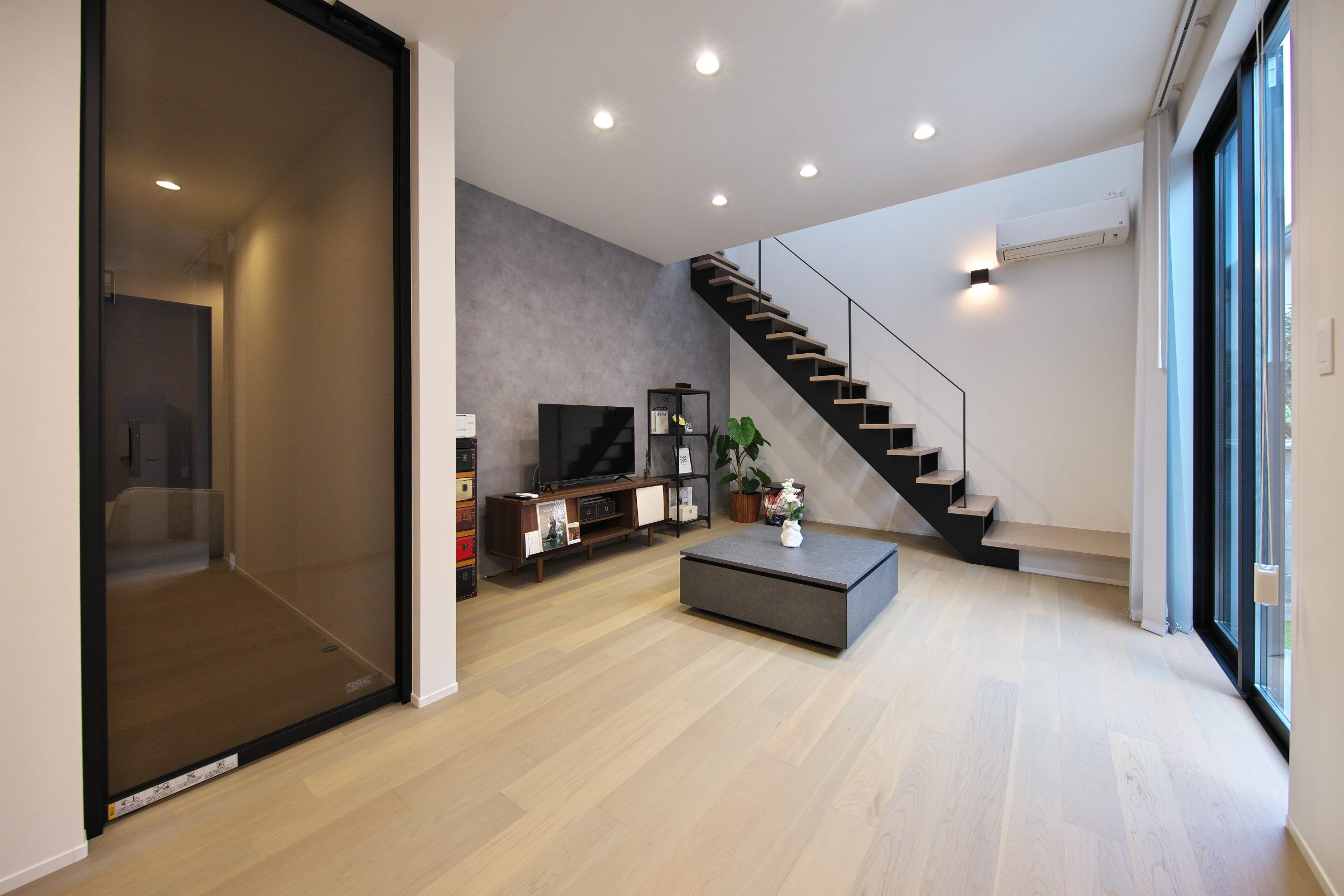 内装は、黒を基調としたモノトーンスタイルに合わせ、建具・キッチン・階段・照明まで全体のトーンを統一。無機質になりすぎないよう、床材や木の質感を組み合わせてバランスよく仕上げています。