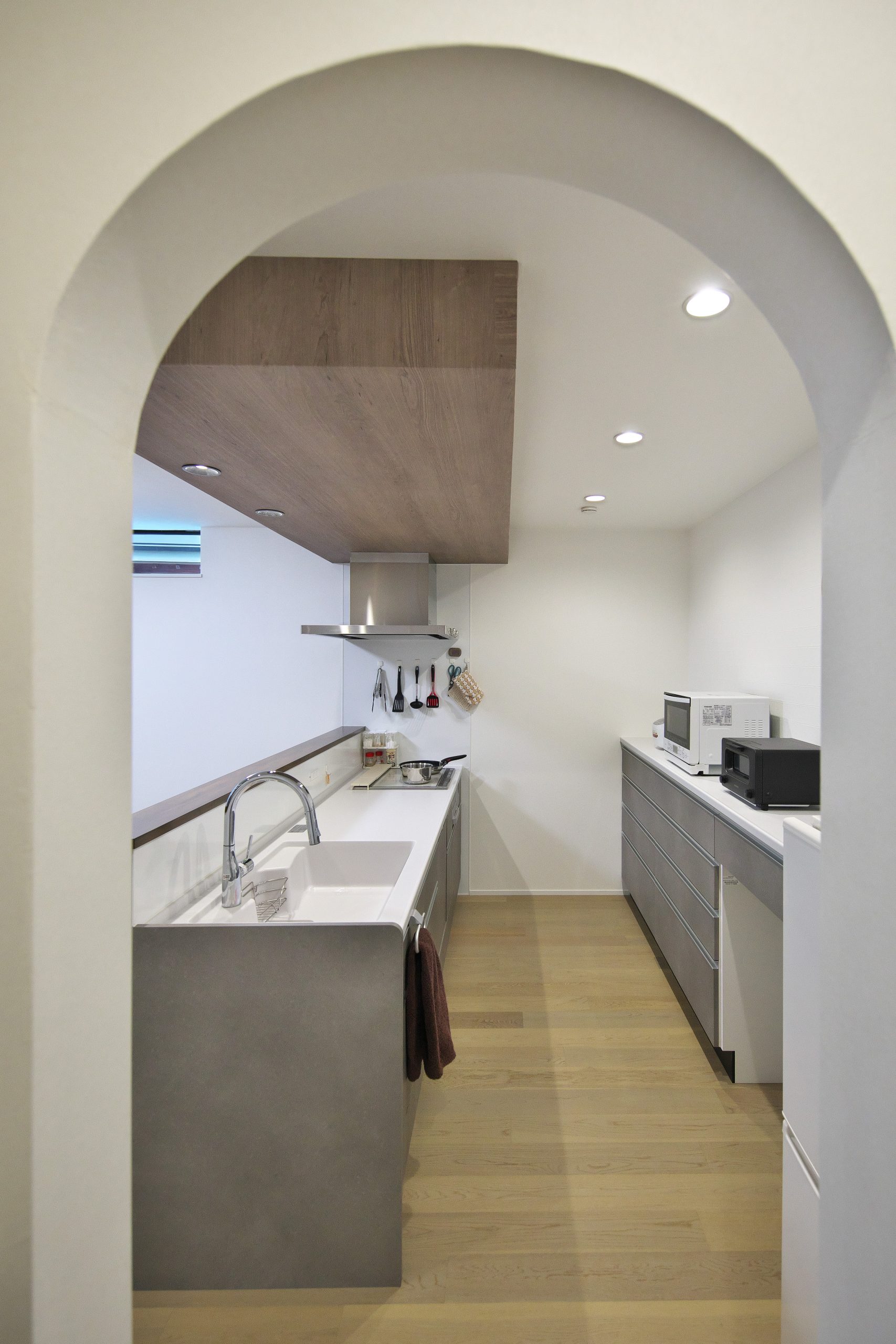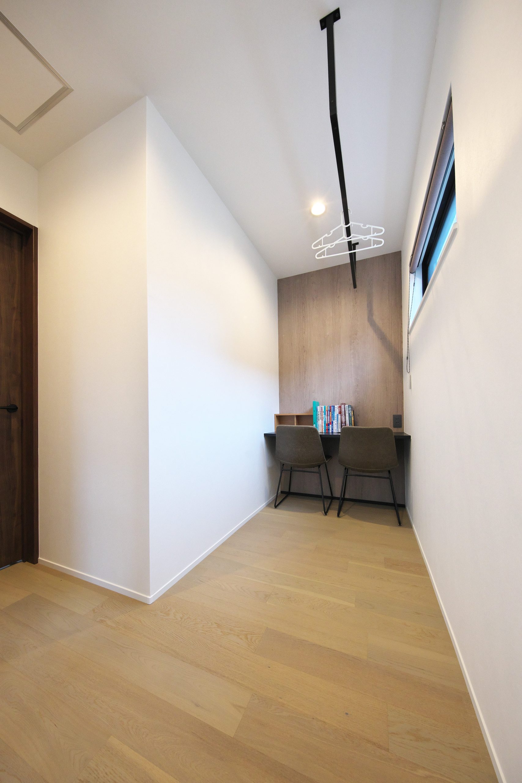キッチン周りの回遊性や収納計画、スペースの有効活用など、限られた空間を無駄なく使えるよう設計しています。階段を上がりきったところに、集中できる作業用デスクを設置。