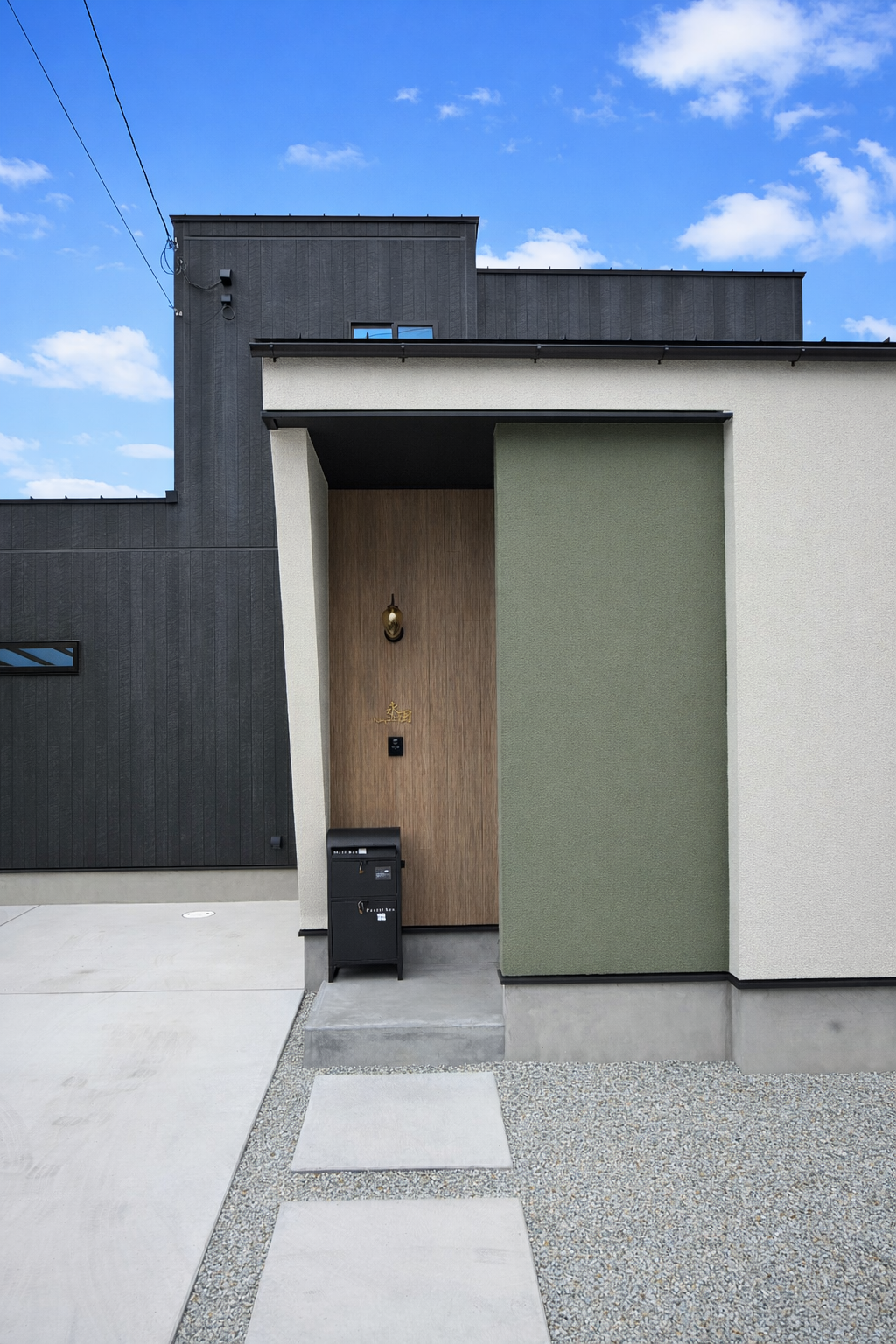 黒と白のコントラストをベースに、グリーンと木目がアクセントの外観。