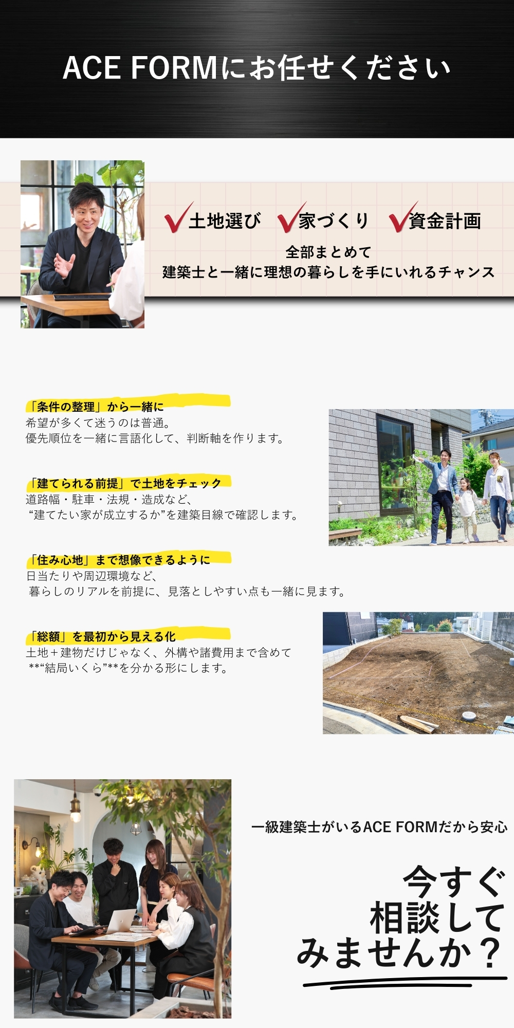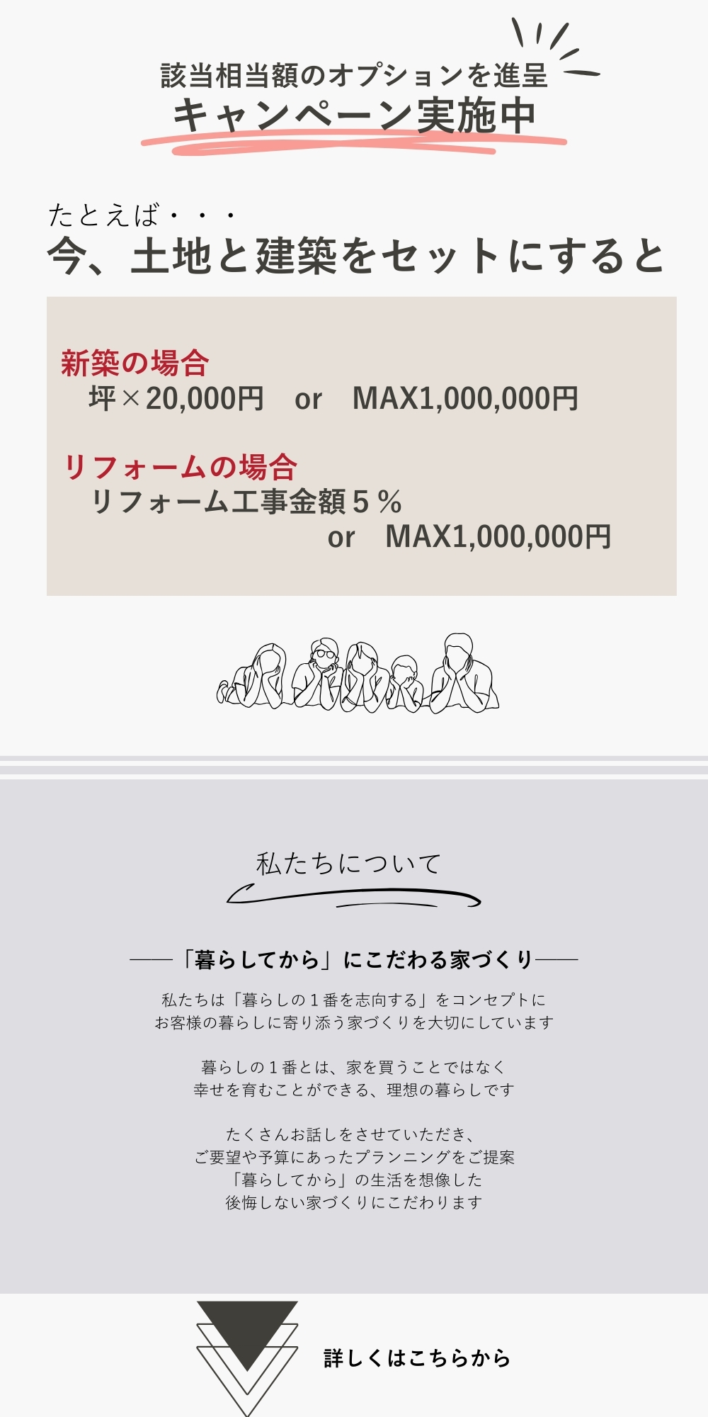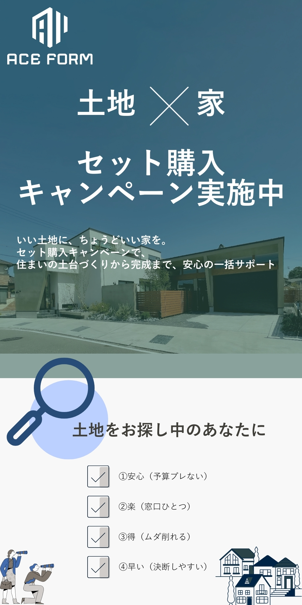 EVENT イベント情報 その他 2026.02.14 土地×家 セット購入キャンペーン いい土地に、ちょうどいい家を。 セット購入キャンペーンで、 住まいの土台づくりから完成まで、安心の一括サポート 氏名(必須) 電話番号(必須) メールアドレス(必須) お問い合わせ/ご質問等 (任意) このフィールドは空のままにしてください。 個人情報の取扱いを許可する BACK 一覧へ戻る